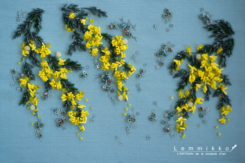 ミモザのオートクチュール刺繍はいかがですか? フワフワっとしたミモザの花。 丸ビーズで表現すると 何となくイメージは出来てしまう…。 レンミッコ なら! あえて竹ビーズの様な形のビーズを使用。 その素材名はクォーターティラビーズ。 ミユキビーズから販売しているビーズです。 フワフワっとしたイメージのミモザの花。 そのイメージとはちょっと違う? しかし、そこはあえて挑戦です。 イメージできる素材より 概念を捨てて 面白い素材を使った 刺繍の方が良いかな… と常に思ってるレンミッコ です。 さてさてどうなったかと言うと… 上の画像の様な刺繍になりました。 遠くから見たらミモザです! 近くから見てもやはりミモザです! 本音はもっともっと冒険をしたいのですが お客様の要望があっての事。 ご要望通りにするのが我々の仕事なので 冒険は刺繍のサンプルで表現することにします…。 イノベーションは大切ですね。 伝統と革新の融合です