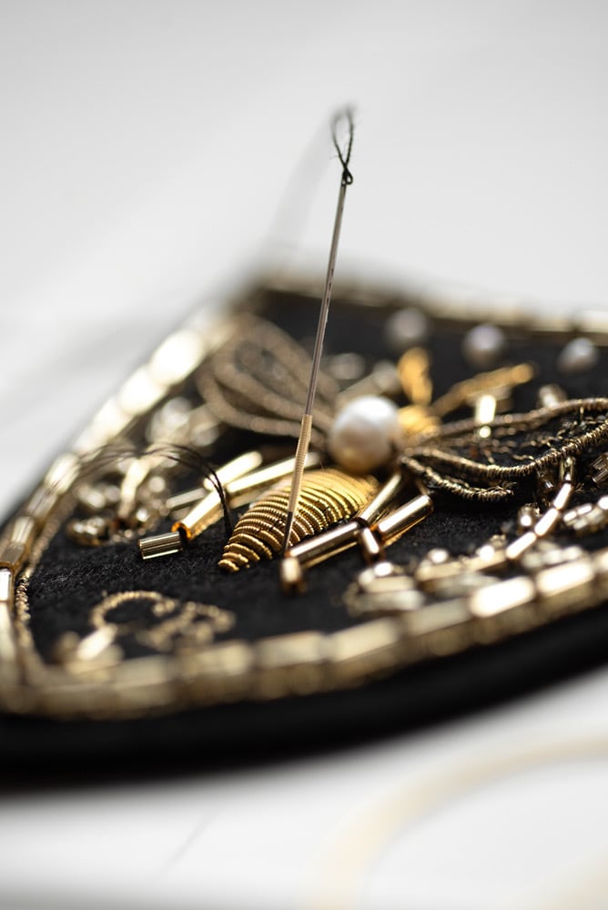 黒のフェルトの上に、金色のビーズやモールを使って刺繍を重ねます。