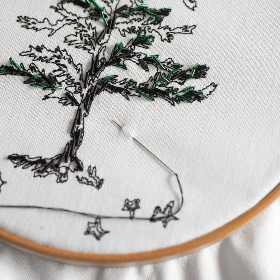 ツリーのアウトラインが刺繍されている布地に、ビーズで枝葉や飾りを付けていきます。