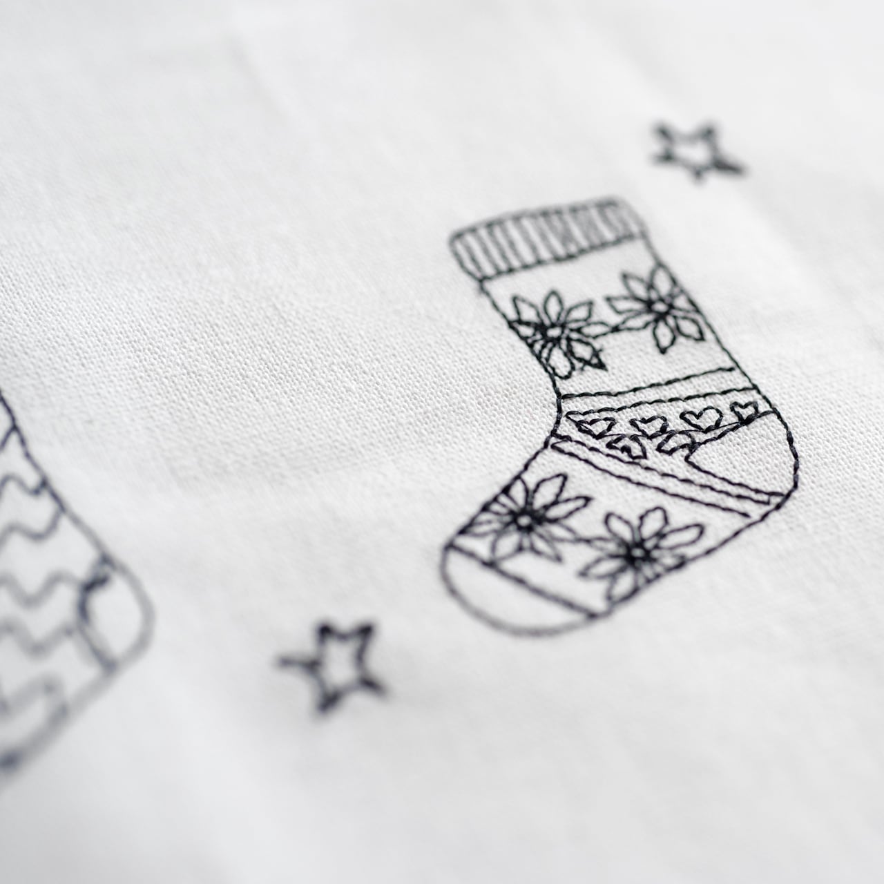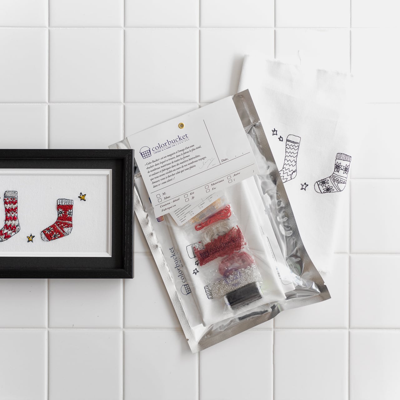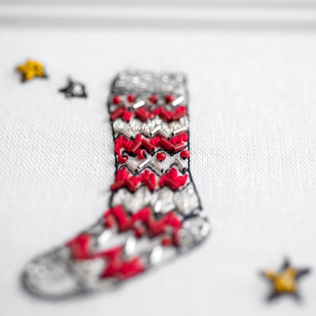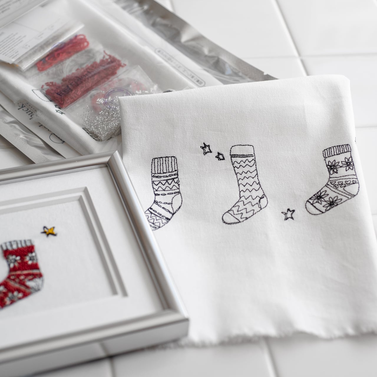 あたたかそうな靴下のアウトラインが刺繍されている布地に、ビーズや糸を手刺繍することで立体感を出しつつカラーリングをしていきます。